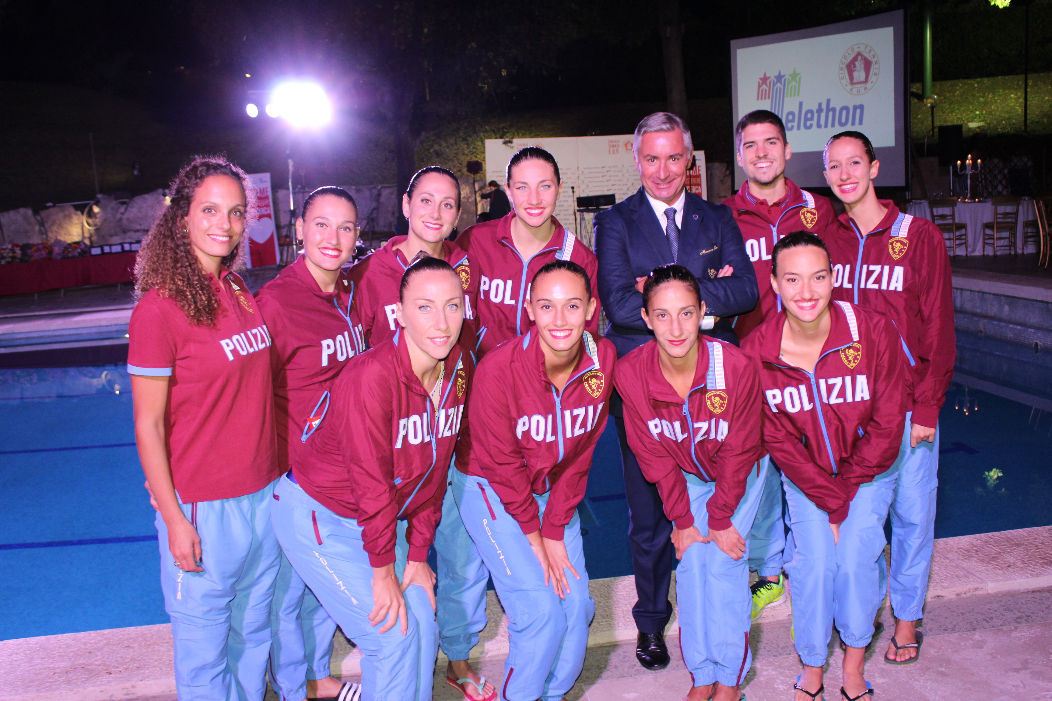 Dopo i ringraziamenti della coordinatrice di Telethon Manuela Mancini e del dirigente BNL Paolo Manusso, sono entrate in scena le ragazze del nuoto sincronizzato con una scenografia spettacolare fatta di immersioni, improvvise emersioni ed evoluzioni, al ritmo incalzante di uno sfondo musicale che sprizzava tanta energia quanta ne esprimevano le atlete: 10 minuti travolgenti delle ragazze allenate da Mariangela Perrupato e guidate da Roberto Bonanni, coordinatore di tutti gli sport acquatici del gruppo atleti delle Fiamme Oro.